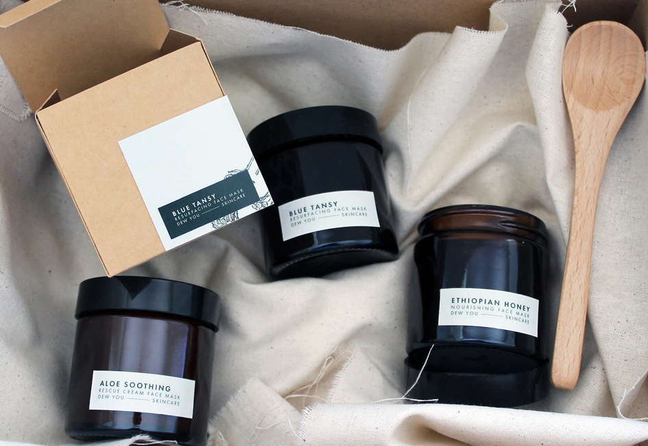 Ivy Orn, Dew You Skincare. Packaging Design: Ink on paper, stickers and glass jars, 2018. A series of personalised face masks
