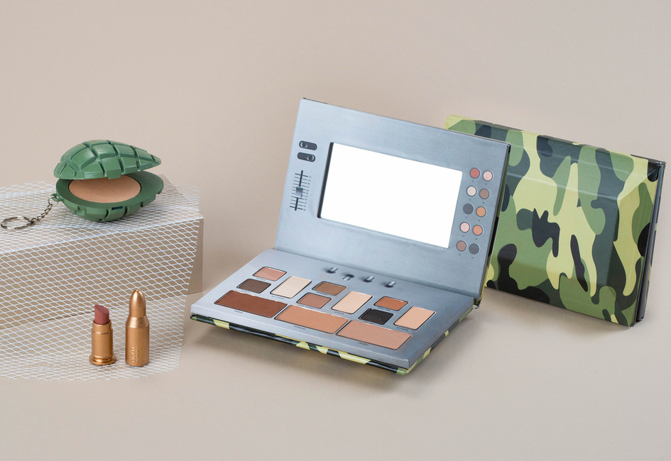 experimentation in order to explore gender identity. The project consists of packaging design for a speculative make up line that uses symbols of war in order to provoke a conversation on issues of how we represent gender.